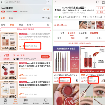 即便是和同为国货彩妆的完美日记、花西子等品牌对标,novo的价格也远低于它们。譬如眼影盘,完美日记旗下的锦鲤盘售价为179.9元,而novo旗下最贵的一款眼影盘,也不过43.9元,不到前者的四分之一。