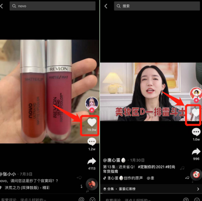 因此,我们能看到,不论是小博主还是大博主,只要吐槽novo,就能获得流量。下图中,左边是粉丝数在7万左右的博主,右边则是粉丝数在700万左右的博主,但她俩关于novo的吐槽视频都获得了数十万点赞。