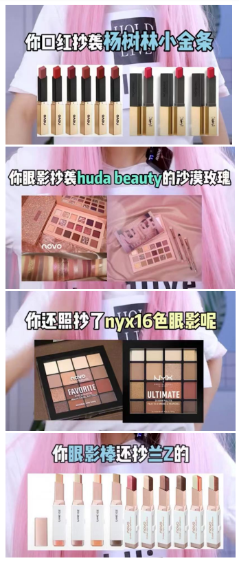 但novo不一样。美妆博主“杨子江River”就曾列举过,它的遮瑕抄袭Lamer、口红抄袭ysl、唇釉抄袭露华浓、粉底液抄袭欧莱雅和红地球、眼影抄袭伊蒂之屋……可以说,从国内品牌到国外品牌,从一线大牌到欧美开价,novo全抄了个遍。