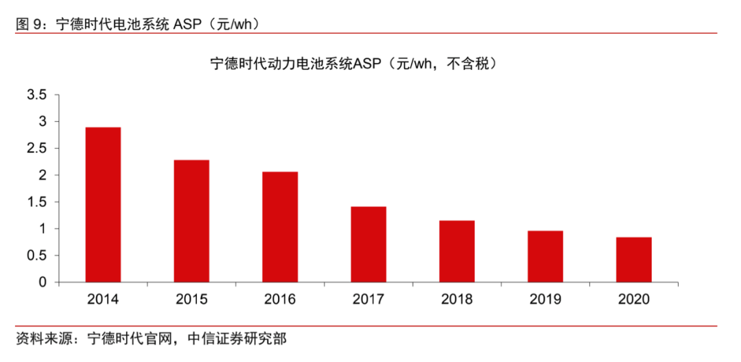 随着电池技术的不断升级,以及规模化生产带来成本下降,纯电动汽车的优势将会表现的更加明显。据中信证券,宁德时代的动力电池系统平均售价,已经由2014年的2.89元/wh降至2020年的0.84元/wh。