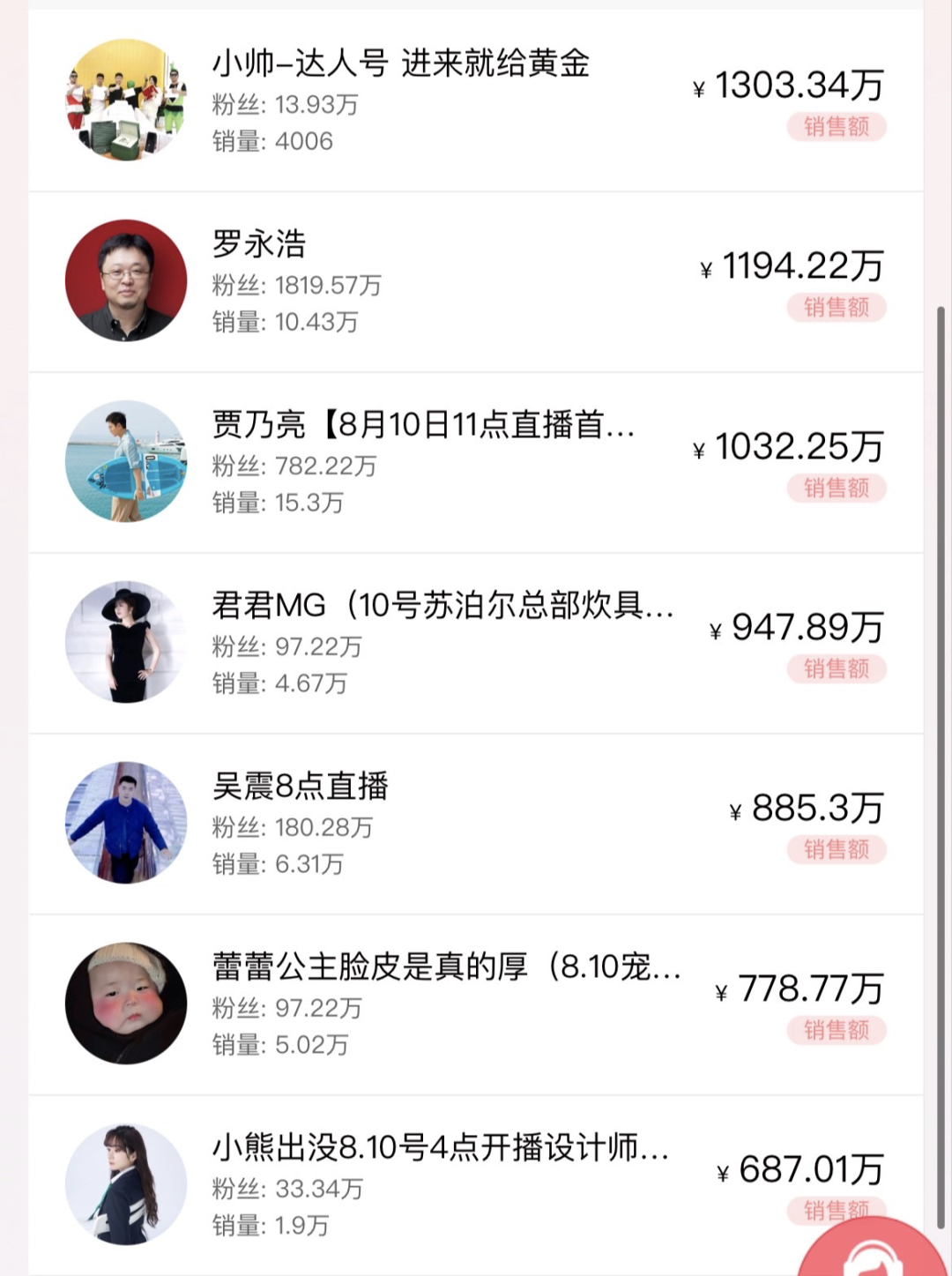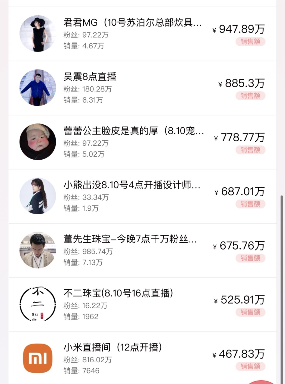 (8月10日抖音销售额排行榜,小米直播间位列第十)