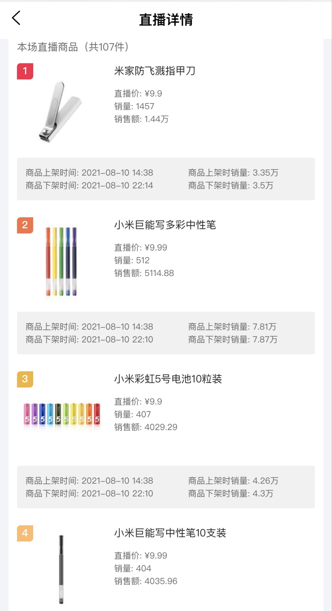 抖音的小米直播间里,挂在最前面的几个商品链接,分别是指甲刀、巨能写中性笔和彩虹电池。这几件9.9元的低客单价商品,分别成为本次雷军直播中最畅销的单品。