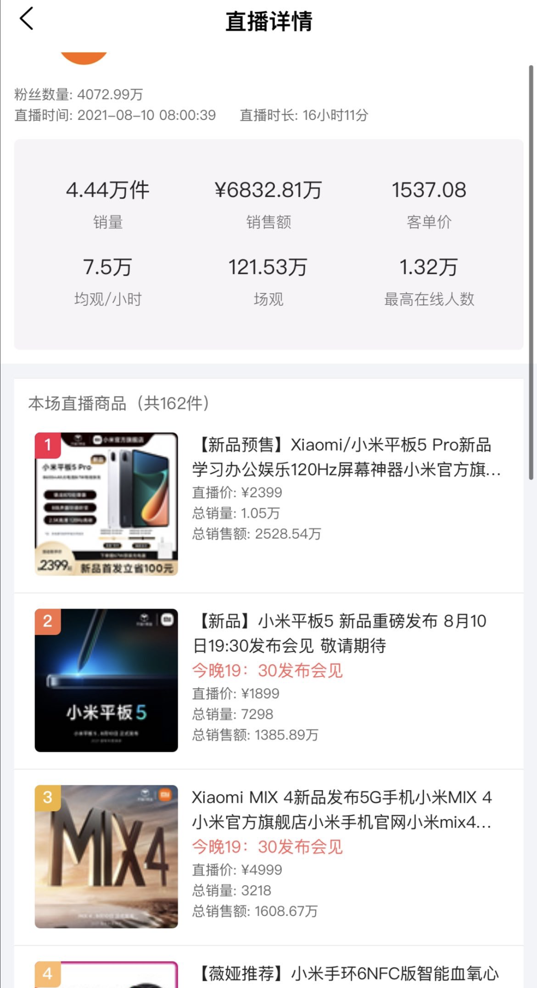 淘宝直播间共卖出了4.44万件商品,在商品链接中,高客单价的手机、空调、电视位列前排。当天销售量最高的三件商品依次是单价在2399元的小米平板5 Pro、1899元的小米平板5和4999元的小米MIX 4手机。它们都是本次小米发布的预售新品,也将客单价拉高到超过1500元。