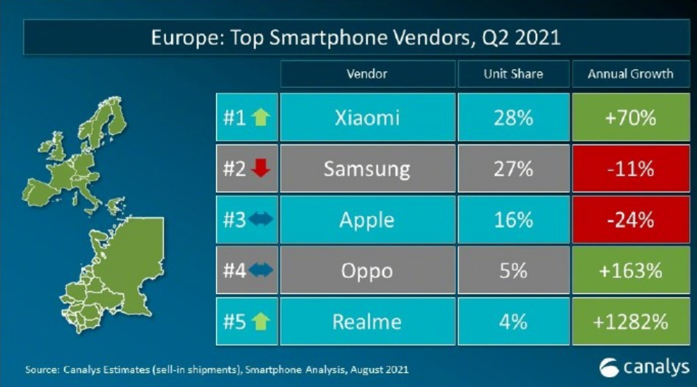 2021年Q2欧洲手机市场情况,图源Canalys