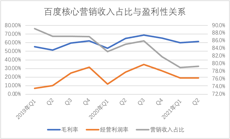 在上图中,百度核心营销收入与社消基本呈同频共振,但在2020年之后亦发现百度核心营销收入曲线斜率变大,在疫情之后社消不振背景下,有逆势增长的苗头,2021年Q2,社消显出明显疲态,内需呈被压抑的状态,但百度曲线则呈上扬的势头。
