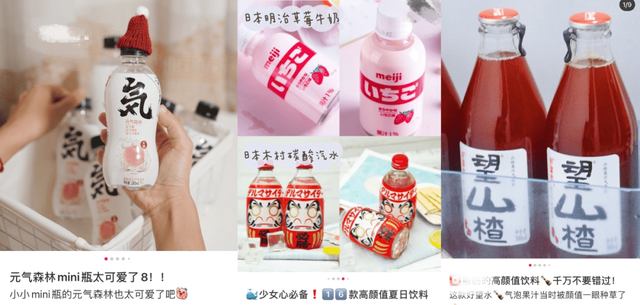 出自元气森林、汉口二厂、好望水,以及日本明治、有树、不二家等品牌的饮品,包装风格或为“十足的国风”或是“清新的日系”,瓶身或饮品颜色以低饱和度为主。