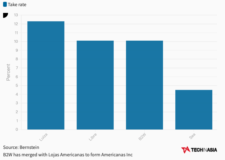 Magazine Luiza、Mercado Libre和B2W的抽佣率都是Shopee的两倍以上。假设Shopee的拉美业务能够与本地玩家相媲美,应该会提高整个业务的占有率。
