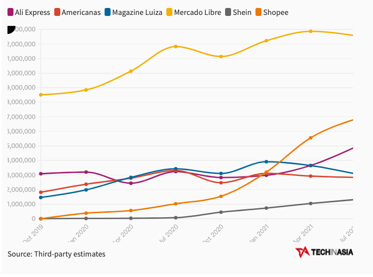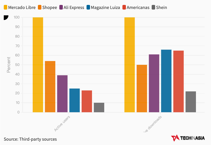 在巴西,Shopee的活跃用户数量排名第二,仅次于阿根廷的电商平台Mercado Libre。只用了不到两年的时间,Shopee从零积累,活跃用户数量超过了市场领导者的一半,这一成就相当引人注目。