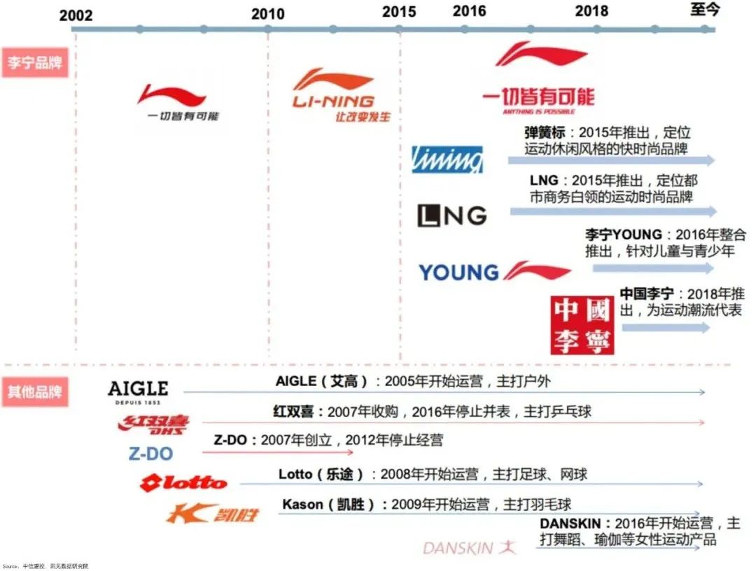 与安踏类似,李宁的品牌扩张也从并购开始——2002年后逐步开拓Kappa、AIGLE、红双喜、乐途、凯胜等运动服饰及器材,探索多品牌矩阵。