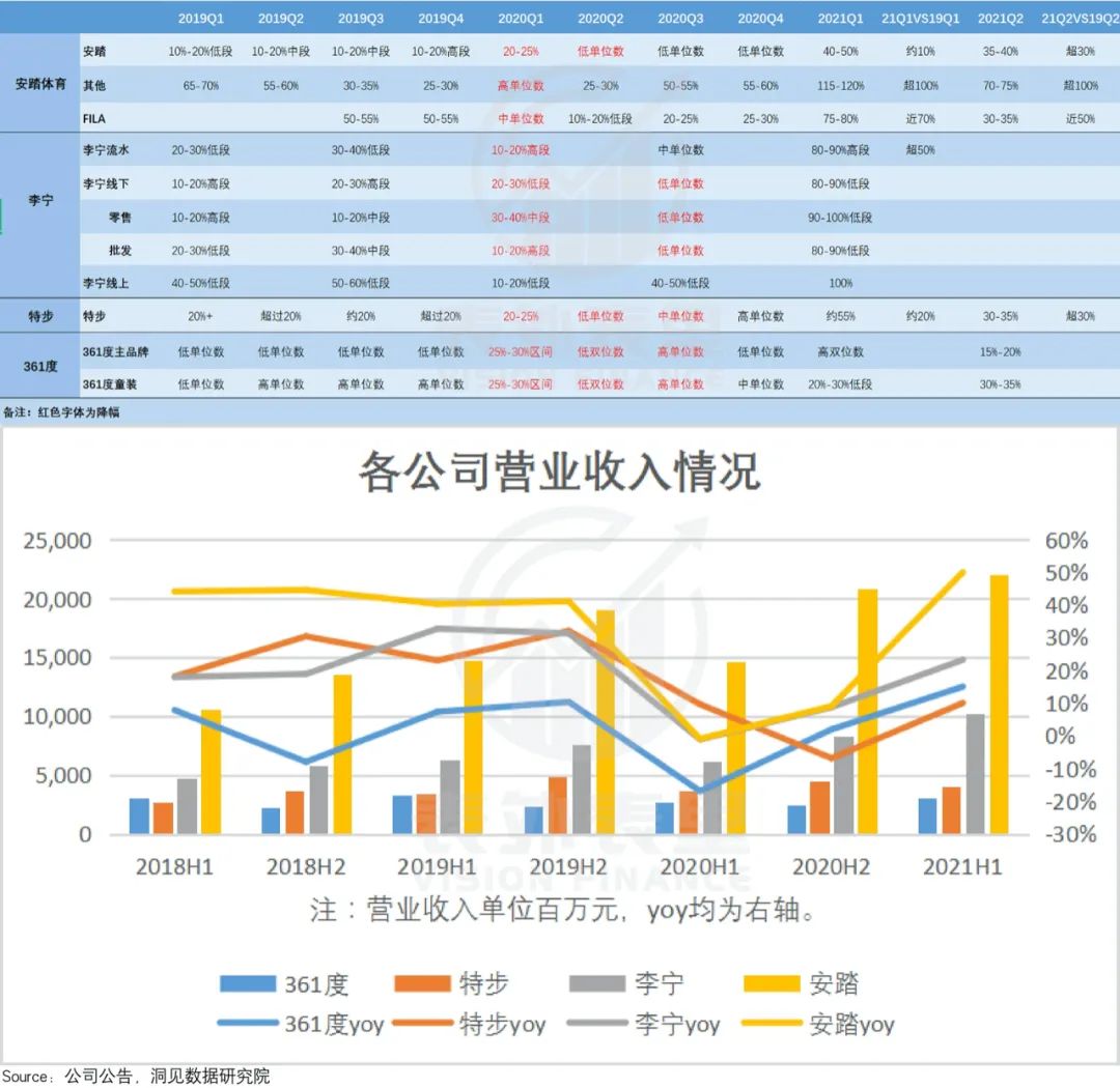 国产品牌李宁、安踏、特步和361度,则统一自2020H2起,营收增速均呈上升趋势。
