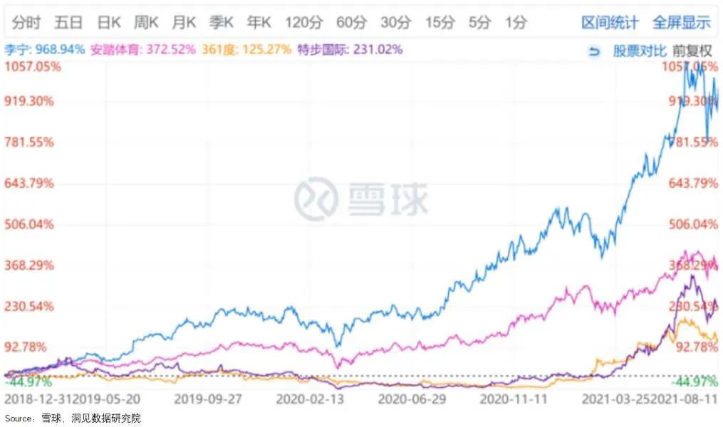 相比之下,安踏的长期增长确定空间最大,李宁仍具有想象力,特步尚有一追之力,361度的风险性较为突出。