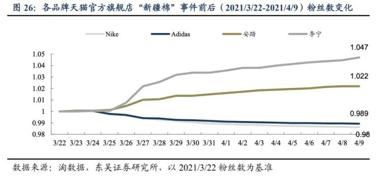 可以看到,此事件后, Nike 和 Adidas 天猫官方旗舰店粉丝数确实有所下降,与之相对的是,国产品牌安踏和李宁的粉丝数高速增长。