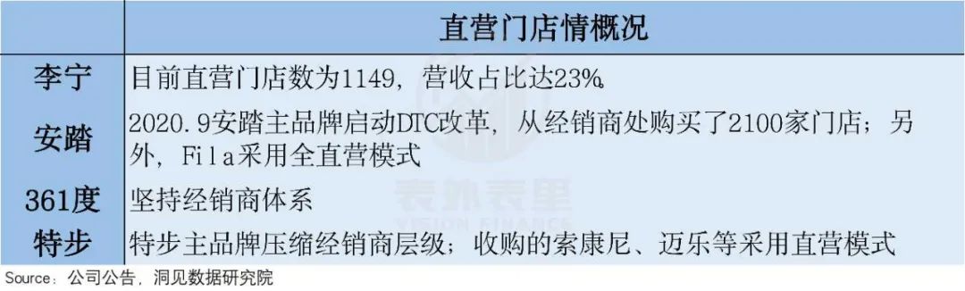 就销售渠道方面,最早切入直营门店的李宁,该板块的营收占比已达到23%;安踏去年启动主品牌的门店直营化,效果尚未可知;特步小步向前;而361度原地不动。各家布局电商的差距不大,目前营收占比均在20%之上。
