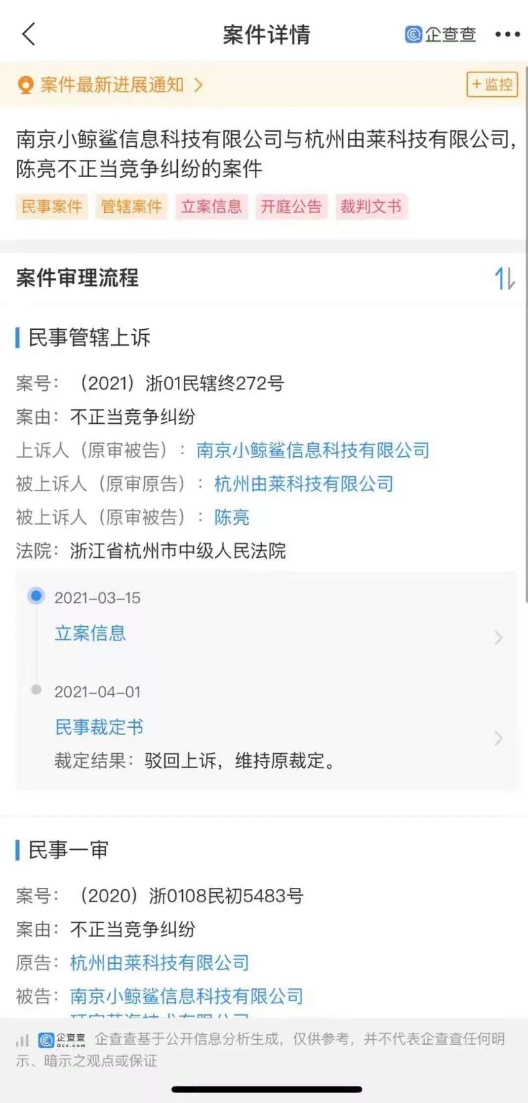 此外,根据企查查方面数据显示,慕金的代理商南京小鲸鲨信息科技有限公司与Ulike代理商杭州由莱科技有限公司曾有一起有关不正当竞争纠纷的案件,目前已经立案。原告杭州由莱就被告南京小鲸鲨编造虚假信息、制作涉案侵权视频和文章等行为提起诉求,法院宣判原告胜诉。后南京小鲸鲨又以初审法院没有管辖权为由提起上诉,但被驳回,维持原判。