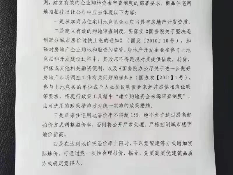 8月11日,一张疑似自然资源部下发的土拍新政更是被热传。根据网图,自然资源部对房企购地的资金来源做出了必须有自有资金等限制,此外还提出了“溢价率不得超过15%”、“不得以配建等方式增加实际地价”的要求。