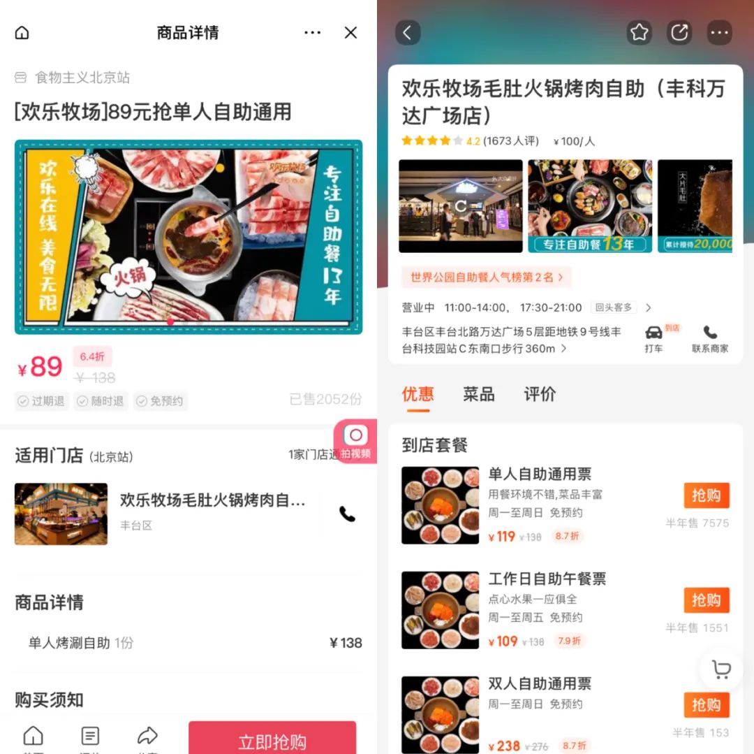 据一刻商业对比发现,原价138元的“欢乐牧场毛肚火锅”的单人自助通用票仅需89元,而在美团则需要119元,抖音优惠力度达到六四折。在其他的商家优惠券中,二、三折也是较为普遍的折扣。