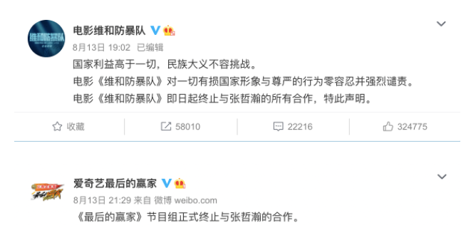 四是个人的某些行为立场存在问题,严重伤害民族情感。近期的张哲瀚事件便是典型的例子。张哲瀚被网友扒出发旭日旗、到乃木神社参加婚礼、到靖国神社拍照等伤害民族大义的行为,对此,各大官方媒体先后发声,合作品牌纷纷解除合作关系,各大平台的社交账号或被禁言、或被注销。