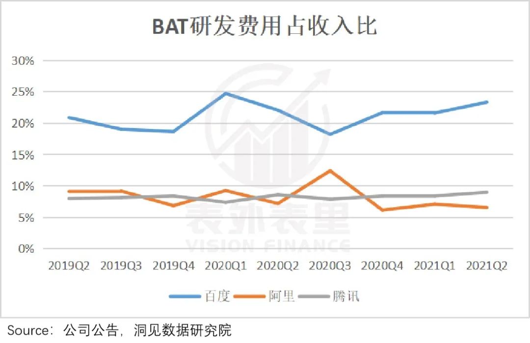 如下图,2021Q2百度研发费用占收入比,大幅增加;相比之下,阿里的研发费用占收入比则有所下调。