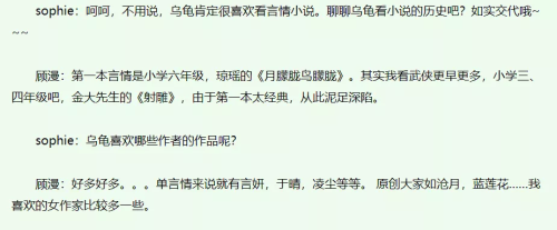 小学六年级时,顾漫阅读了琼瑶的《月朦胧鸟朦胧》,这是她人生中接触的第一本言情小说。