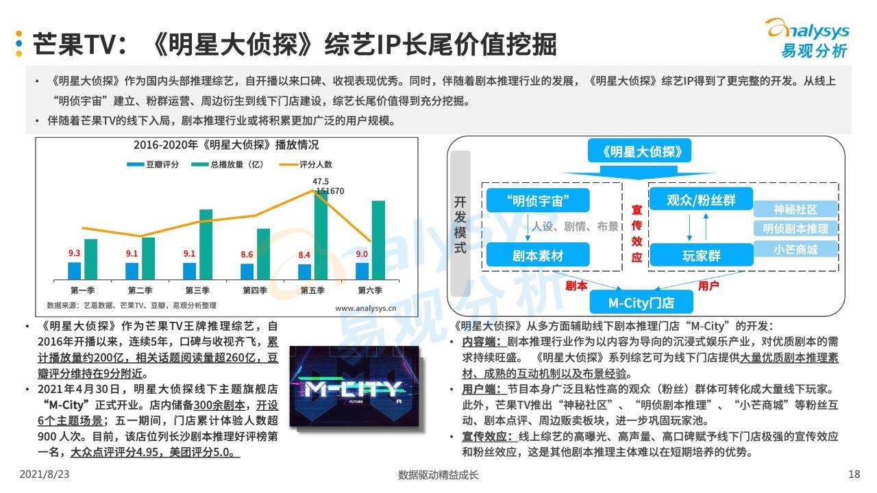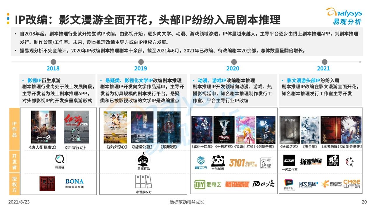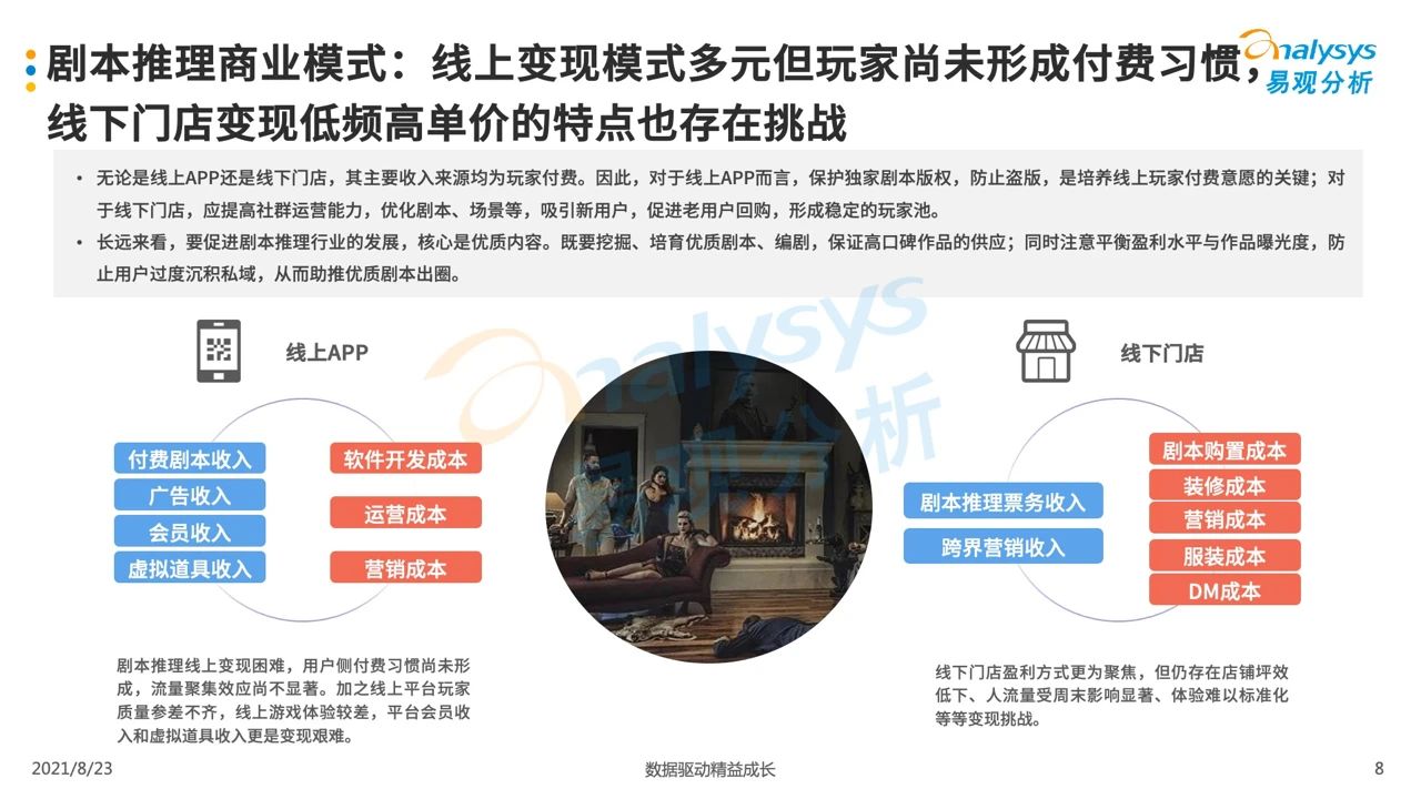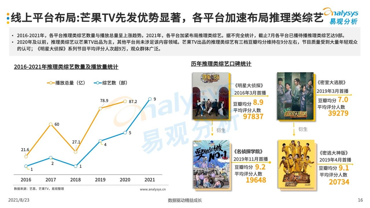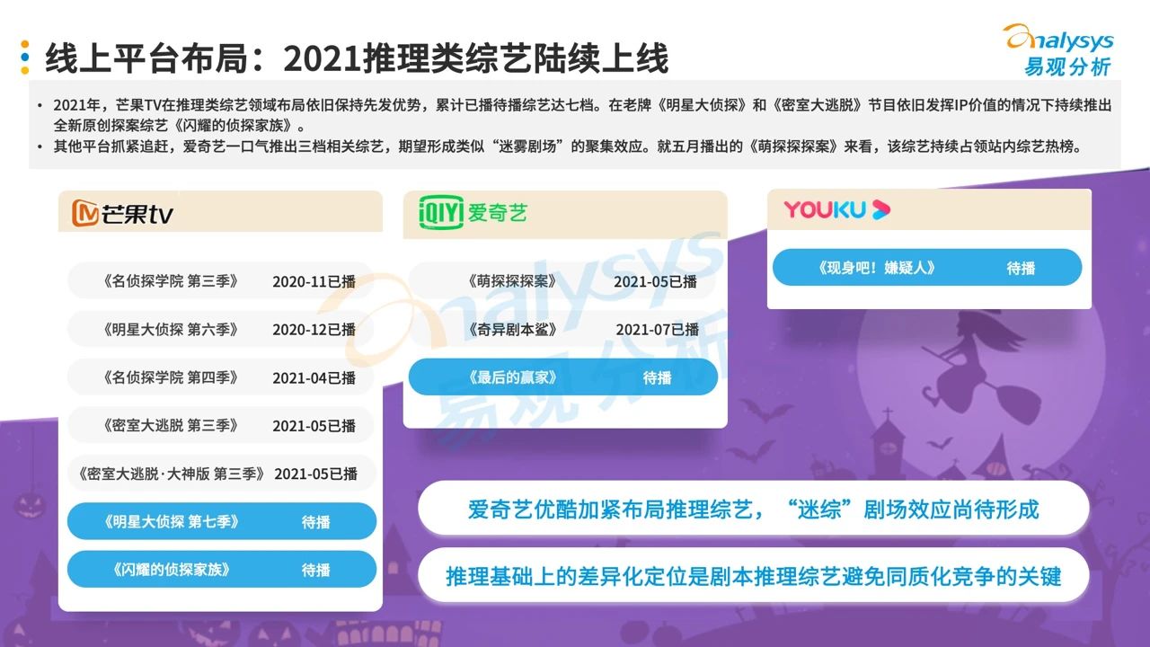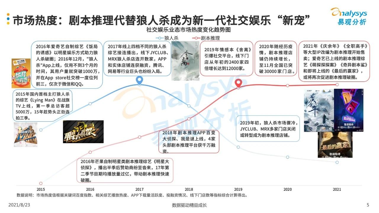 随着狼人杀热度逐渐低迷,剧本杀作为新的社交娱乐活动受到新世代年轻人的喜爱。线上平台也加紧布局推理综艺,芒果TV《明星大侦探》系列综艺先发优势显著,爱奇艺推出三档综艺系统布局。未来,剧本杀将成为IP开发的一环连接线上线下的内容;同时与地方文旅紧密结合,互相赋能。