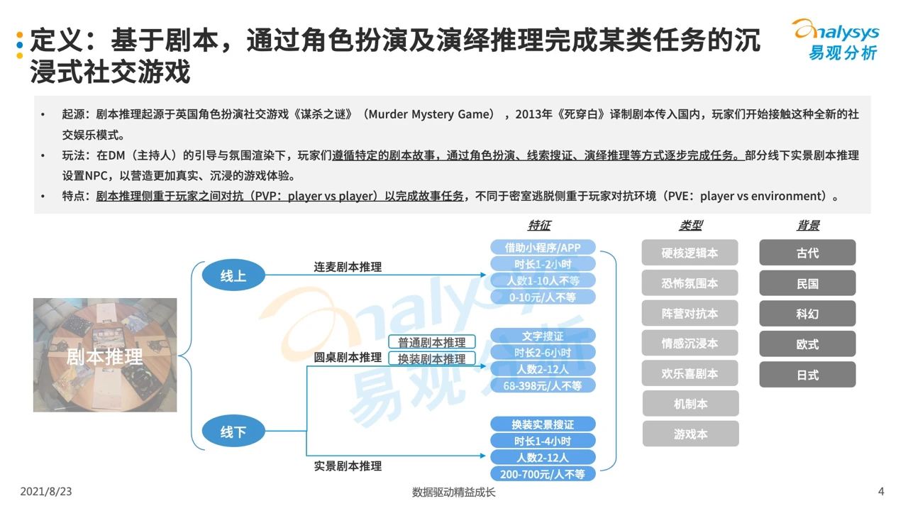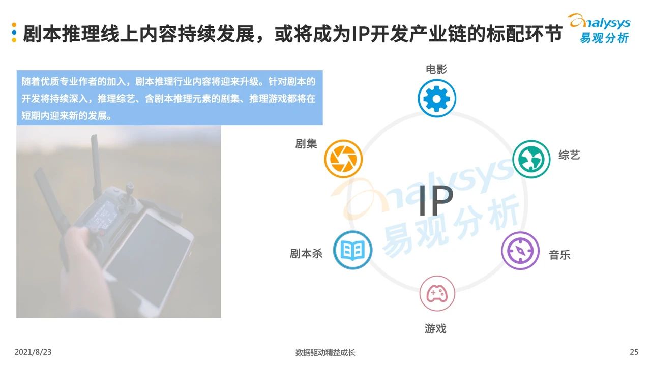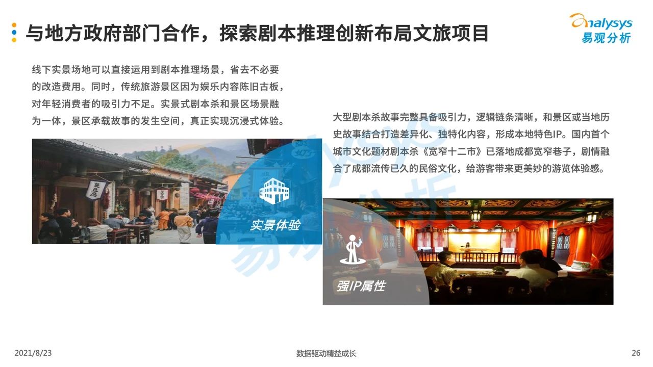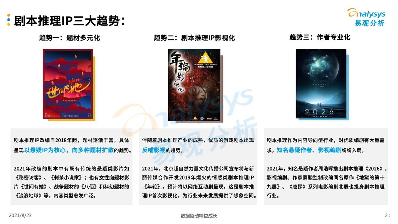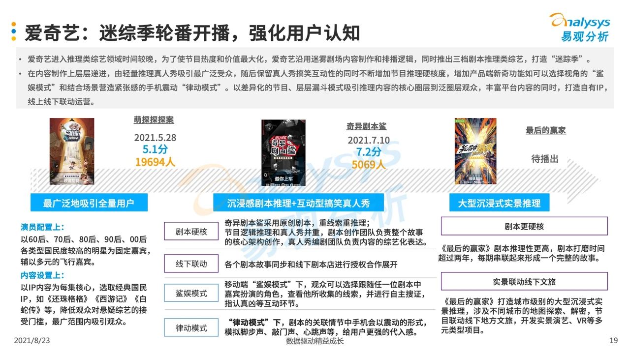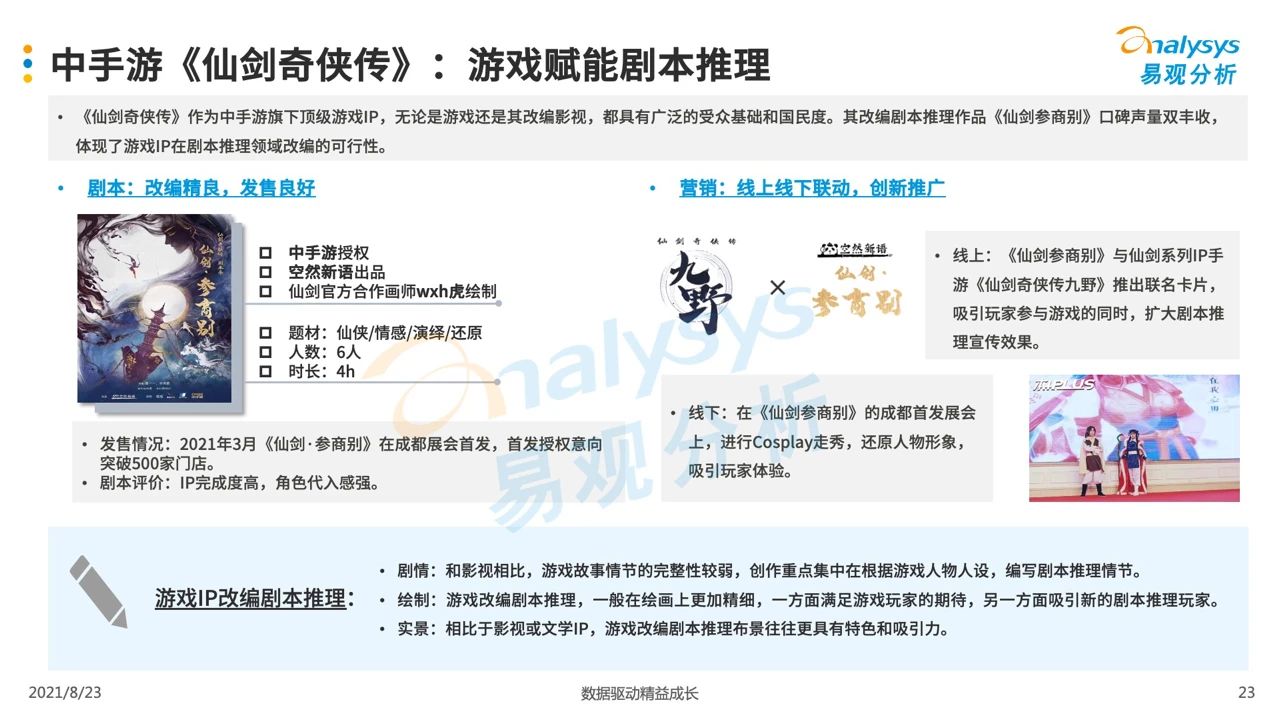 随着狼人杀热度逐渐低迷,剧本杀作为新的社交娱乐活动受到新世代年轻人的喜爱。线上平台也加紧布局推理综艺,芒果TV《明星大侦探》系列综艺先发优势显著,爱奇艺推出三档综艺系统布局。未来,剧本杀将成为IP开发的一环连接线上线下的内容;同时与地方文旅紧密结合,互相赋能。