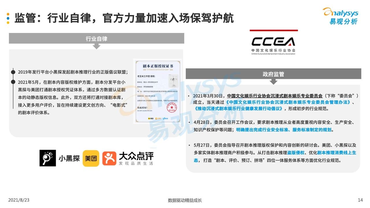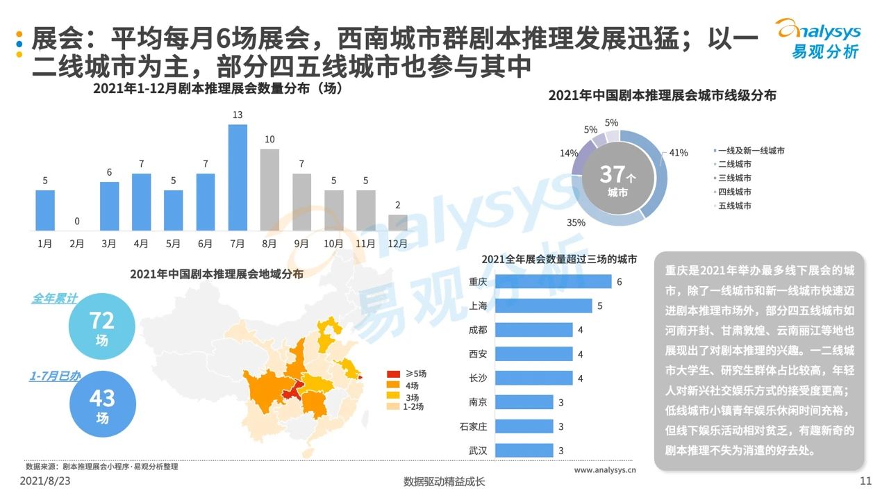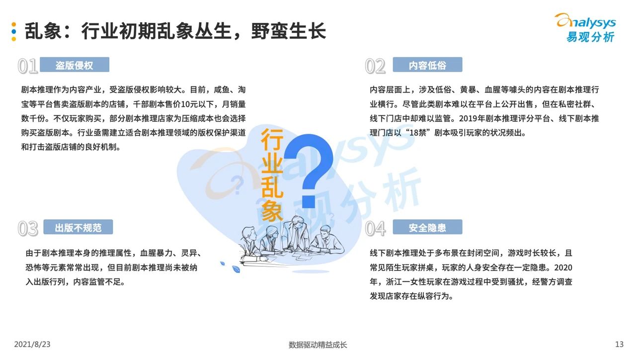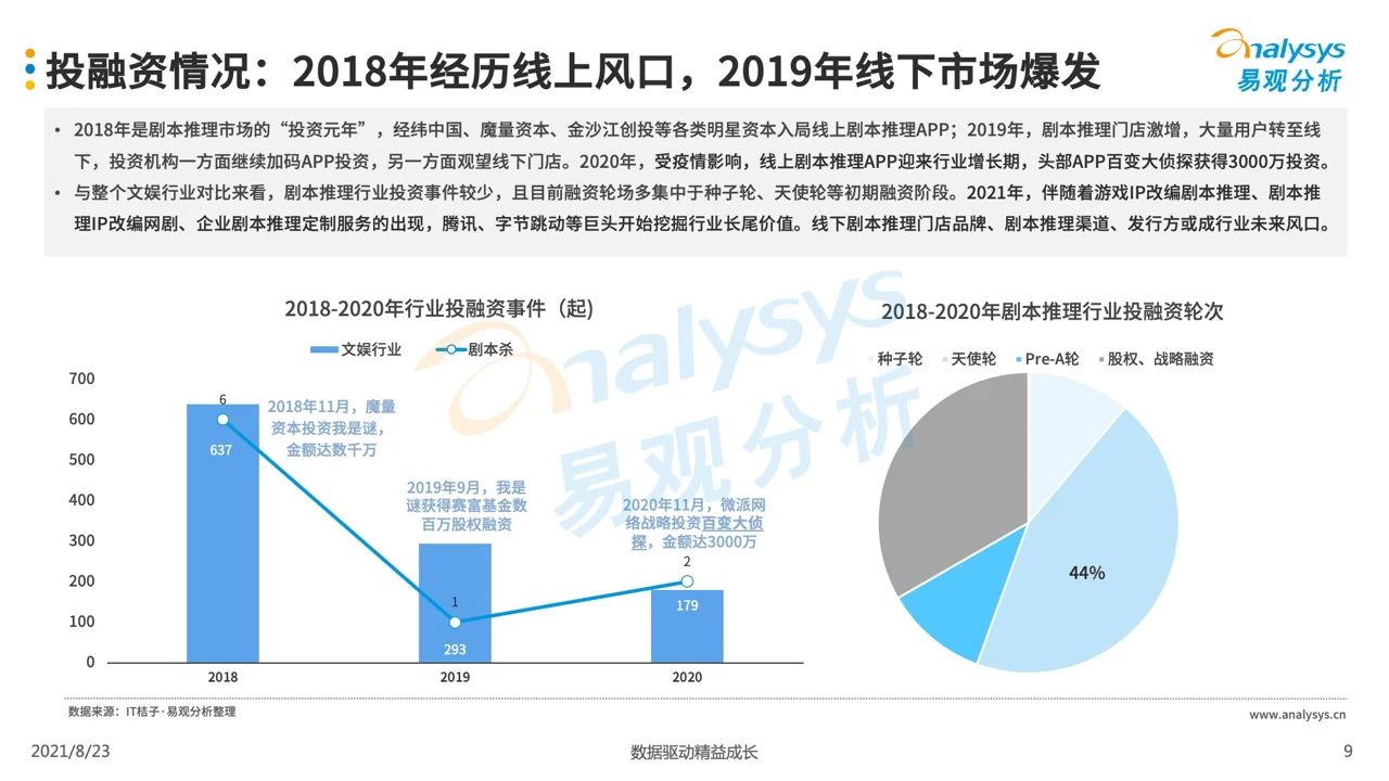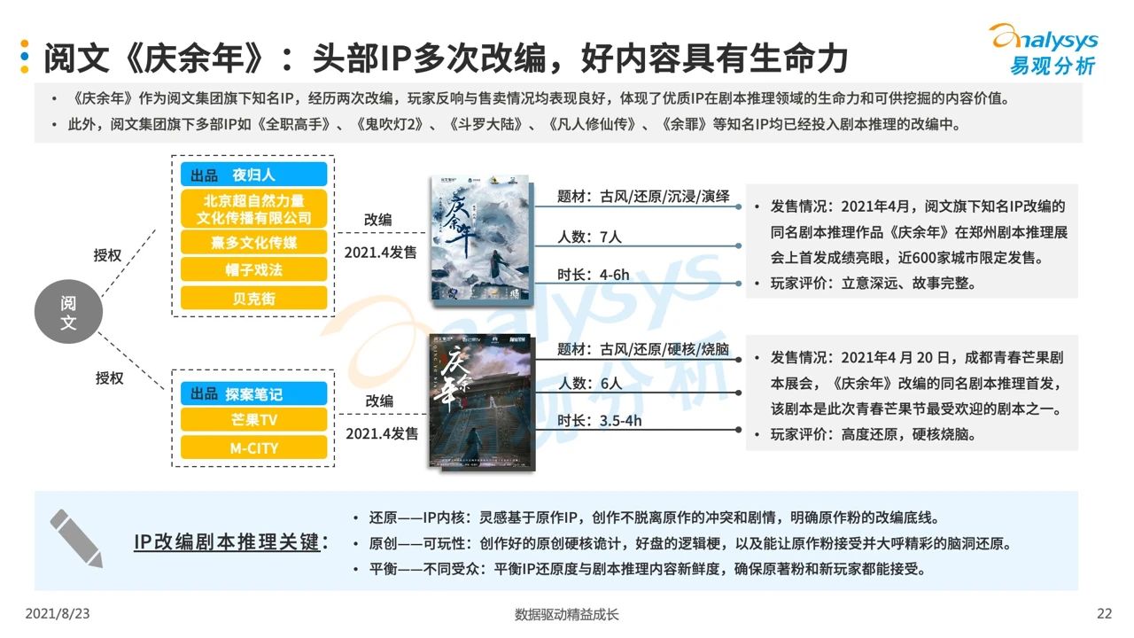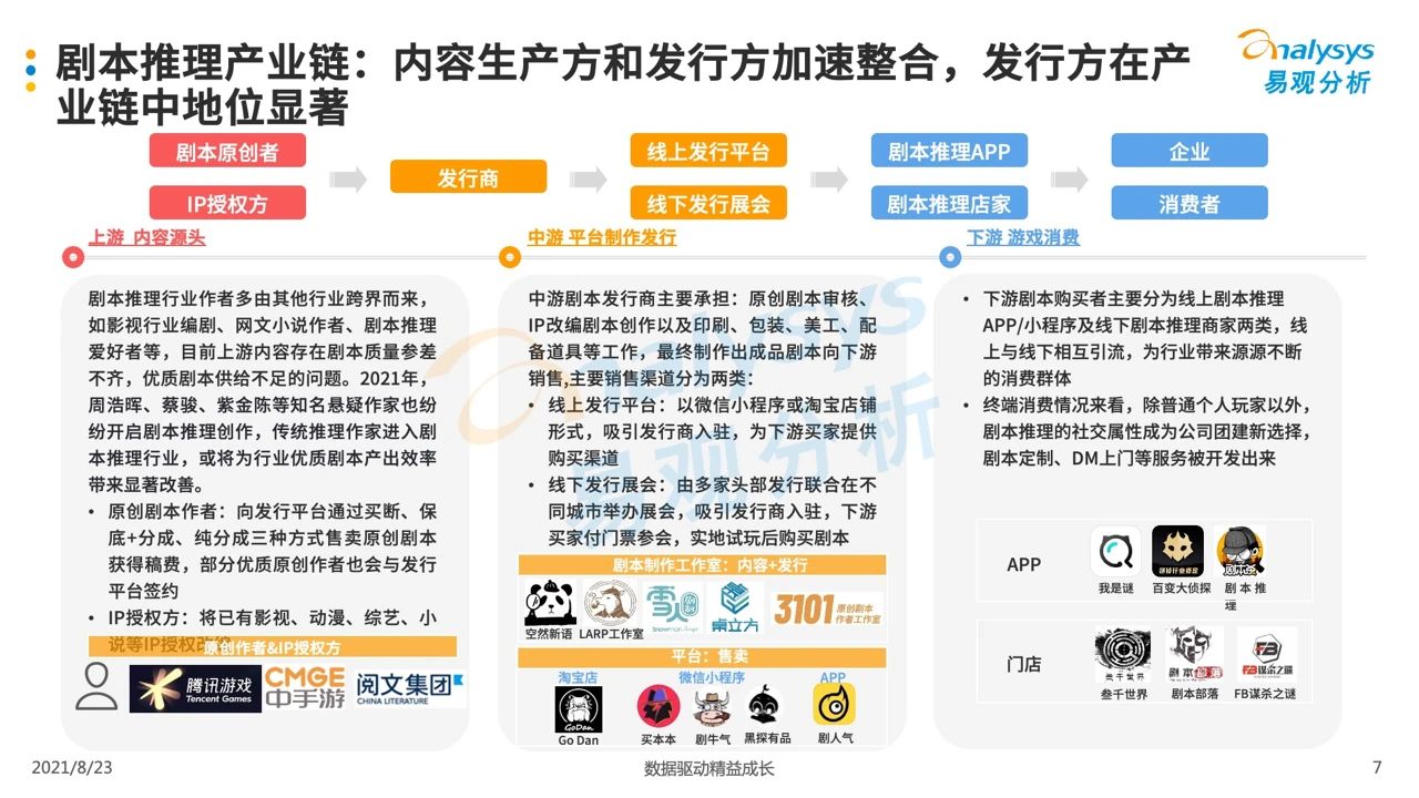 随着狼人杀热度逐渐低迷,剧本杀作为新的社交娱乐活动受到新世代年轻人的喜爱。线上平台也加紧布局推理综艺,芒果TV《明星大侦探》系列综艺先发优势显著,爱奇艺推出三档综艺系统布局。未来,剧本杀将成为IP开发的一环连接线上线下的内容;同时与地方文旅紧密结合,互相赋能。