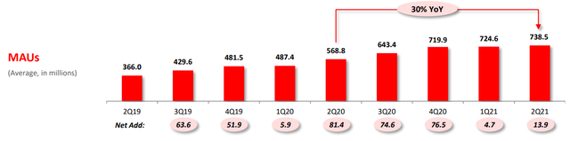 同一时期,拼多多的MAU(月活跃用户)增速也受到拖累。2020年第四季度,拼多多MAU净增7650万;今年第一季度跌至470万,第二季度回升至1390万。