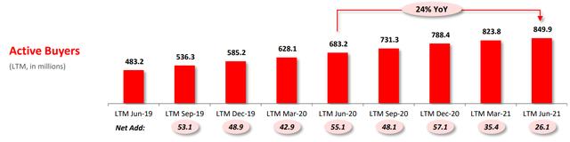 过去几年间,拼多多的单季度年活跃买家增量保持在5000万左右。今年严控支出以来,这一增量下滑明显:2020第四季度净增5710万,2021年第一季度为3540万,2021年第二季度进一步收缩至2610万。