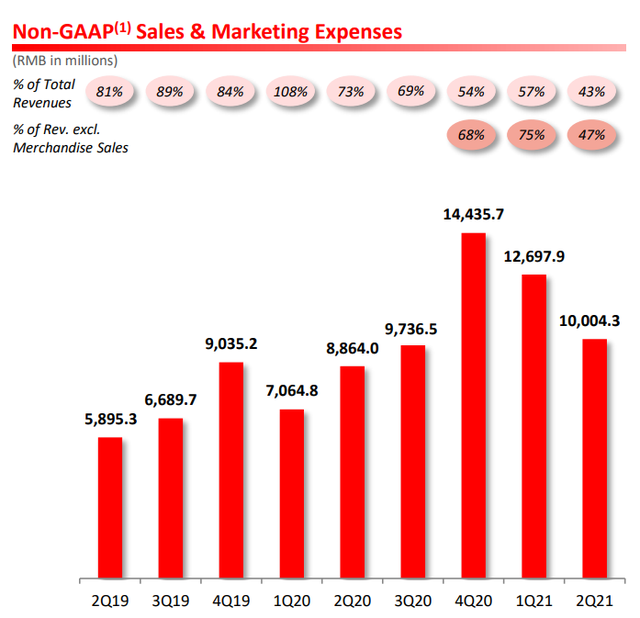 但根据财报,拼多多第二季度的商品销售收入(主要包括多多买菜和自营商品)仅录得19.6亿元。相比之下,2020年第四季度这块收入为53.6亿元,2021年第一季度为51.2亿元。