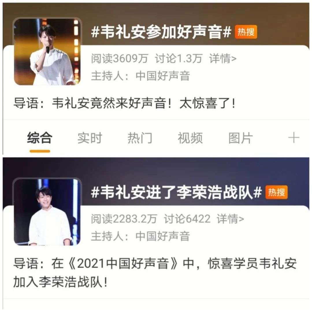 8月20日晚,韦礼安以选手身份参加了浙江卫视《好声音》。在盲选环节中,他演唱了自己的原创新歌《忽然》,获得那英、李荣浩两位导师转身,最终加入了李荣浩战队。随后,“韦礼安参加好声音”“韦礼安加入李荣浩战队”登上微博热搜。