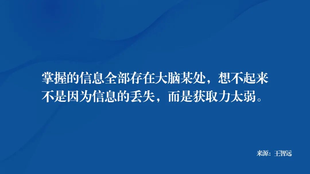 存储很容易,我们天生过目不忘,掌握的信息全部存在大脑某处,想不起来不是因为信息的丢失,而是获取力太弱。