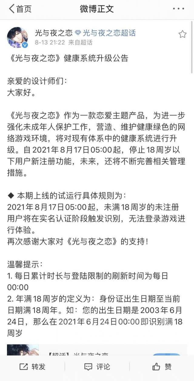虽然放眼整个国内移动游戏市场来看,《光与夜之恋》这次针对未成年人的措施的严厉程度确实有些“破天荒”,但就游戏本身而言,却也并非毫无预兆。早在8月13日,《光与夜之恋》官方就在《健康升级系统公告》中,宣布将停止18周岁以下玩家注册游戏。