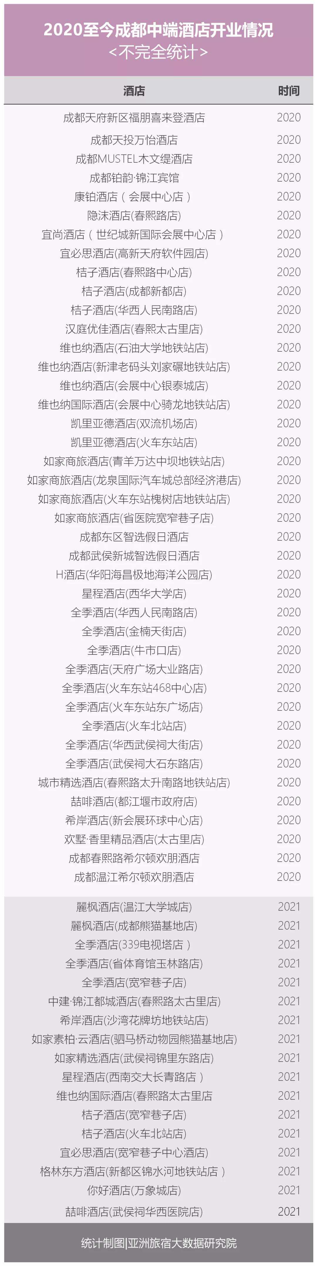除此之外,亚洲旅宿大数据研究院对于近两年来高端酒店品牌进军成都市场的统计发现,2020年至今不到两年的时间里,就有10家高端酒店开业。仅2021年上半年就有4家高端酒店开业,且待开业酒店的数量也达到惊人的11家。