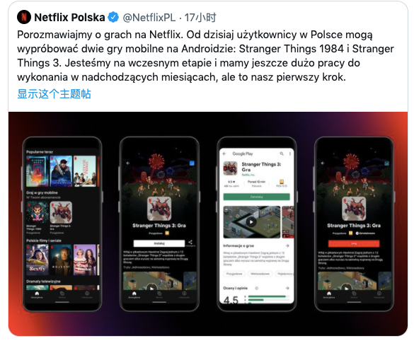 美国当地时间8月26日,Netflix波兰官推发文称,即日起波兰Netflix会员可使用安卓手机体验两款游戏。它们分别是《Stranger Things 1984》、《Stranger Things 3》,均属于解谜题材游戏。