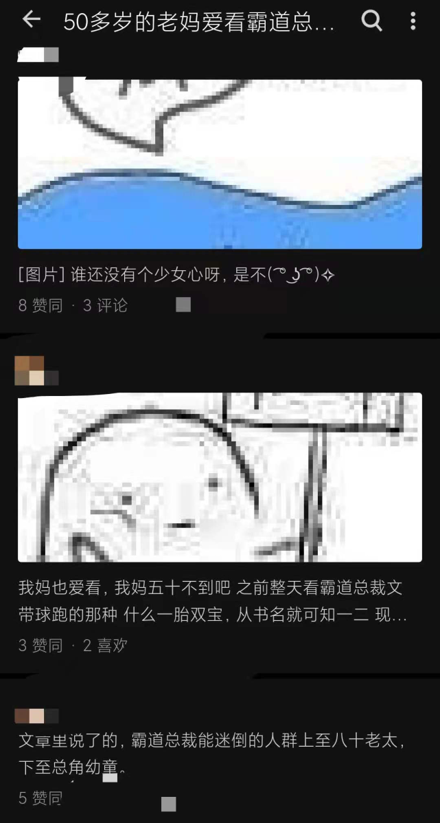 在豆瓣、知乎平台上,也能看到一些年轻用户发帖吐槽,地铁上有老大爷用平板电脑追霸总(外放听书),老妈做饭不忘用广播听甜文,年近古稀的老爸最近爱用手机滚动播放“痞子逆袭”小说,楼下的保安大叔梦想着成为赘婿......