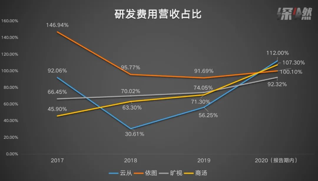 商汤和旷视在报告期内的研发投入力度相对稳健,伴随营收的增加稳步提升;云从最不稳定,2018年全年的研发投入只有1.48亿元,营收占比为30.6%,到2020H1,对应的比例是112%;依图的研发费用占比始终保持在90%以上,2020年上半年超过了100%。