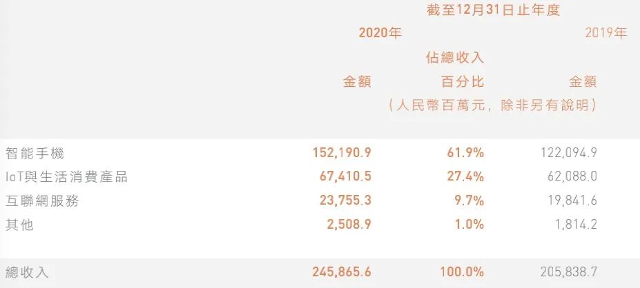 财报显示,2020年小米智能手机业务收入1522亿元,IoT以及生活消费产品收入621亿元,分别占总收入的61.9%和27.4%,两者已经占总营收的89.3%,将近90%。