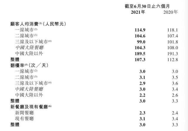 一般来说,连锁餐饮企业的单日营收=餐厅数量x平均翻台率x台数x客单价。而今年上半年,海底捞的平均翻台率为3次,客单价为107.3元;三线及以下城市的门店翻台率仅有2.9,客单价为99元。新开门店翻台率则更低,仅有2.3。