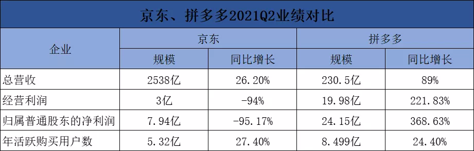 与以往一样,硬核的数据比拼显然更为引人眼球,从核心数据来看,拼多多营收230.5亿元,同比增长89%,低于彭博预期的267.4亿元;京东集团净收入为2538亿元,同比增长26.2%;从利润来看,拼多多本季度归属于普通股股东的净利润为24.146亿元,而京东集团经营利润却仅为3亿元。