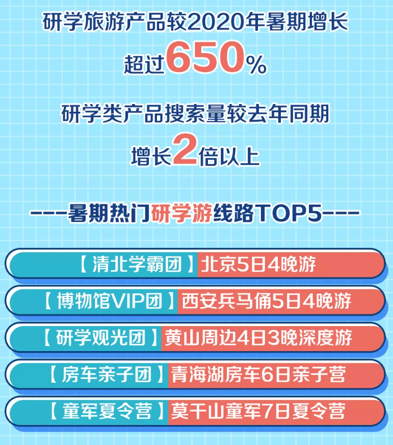 然而与身处教育培训机构的王老师暑期经历不同,研学旅行市场这个假期十分火爆。据携程发布的《2021暑期旅游大数据报告》显示,休闲亲子游、研学旅行体验成为暑期定制游的主力。其中研学旅游产品较2020年暑期增长超过650%,研学类产品搜索量较去年同期增长2倍以上。