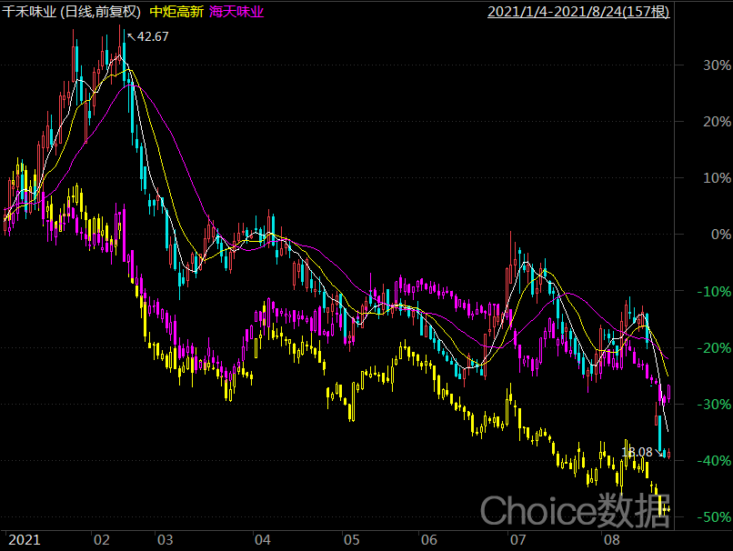 距离牛年春节的喧嚣仅仅过去了半年,A股曾经的调味品三巨头海天味业(SH:603288),中炬高新(SH:600872),千禾味业(SH:603027),市值已经回撤了至少50%。