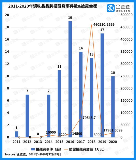 2019年作为海天味业估值巅峰,一级市场的当年披露的投融资金额也将近46亿人民币。