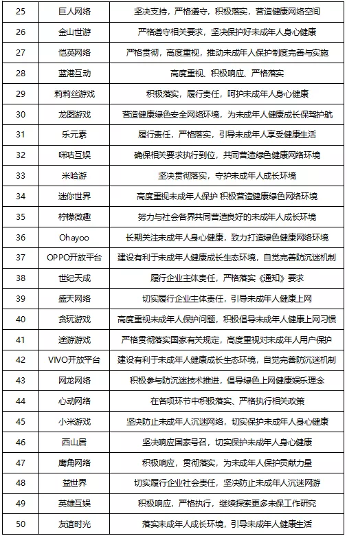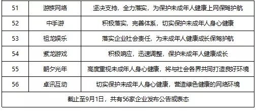 根据中国音数协游戏工委统计,截止发稿前,腾讯、网易、盛趣游戏、哔哩哔哩游戏、米哈游、巨人网络、莉莉丝、叠纸游戏、英雄互娱、心动网络、三七互娱、游族网络、中手游、创梦天地、乐元素、IGG、等56家游戏公司通过官方渠道以公告、通知等方式作出表态或回应。