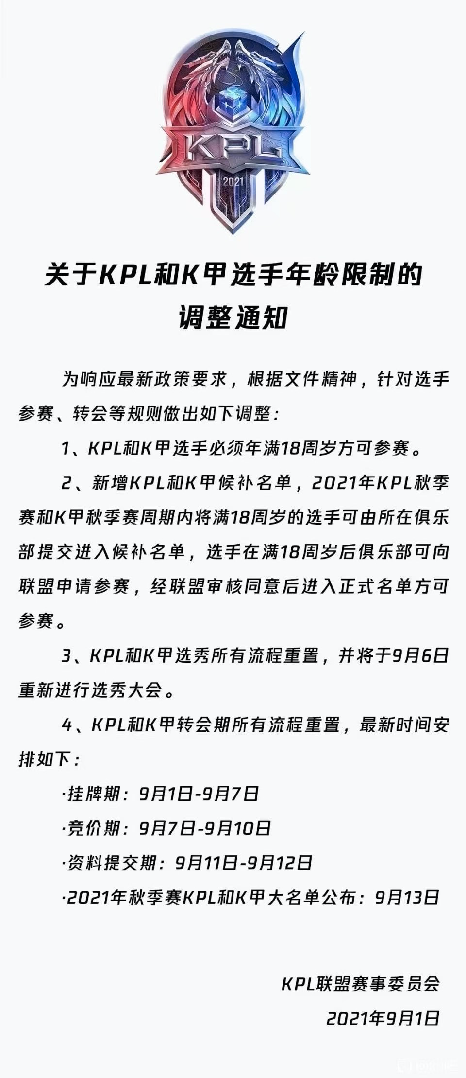 新规出台两天后,KPL联盟赛事委员会于9月1日发布公告,公告中显示KPL与K甲选手必须年满18周岁方可参赛。
