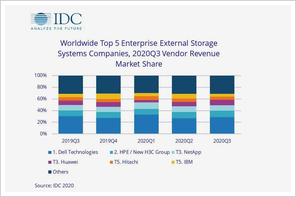 根据IDC数据,2020年第三季度,即便在全球新冠疫情的不利因素影响之下,戴尔科技仍旧是全球最大的外部企业存储系统供应商,市场份额高达28.8%,第二名HPE/新华三的市场份额仅为10.8%。