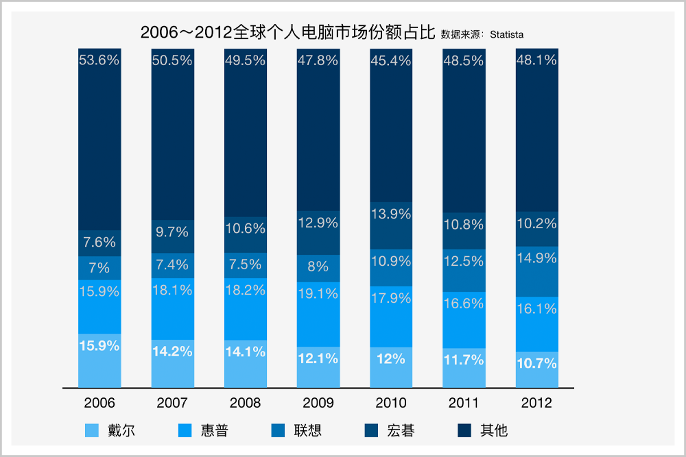 2006-2012全球个人电脑市场份额占比,来源:Statista