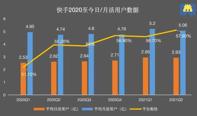 据快手披露数据,2020年春节期间,其主APP的日活就已达3亿。但从财报数据来看,2020年各季度,到2021Q2,快手APP的日活均低于3亿;月活用户在2020年一直不足5亿,2021Q1终于实现突破,但2021Q2又出现下滑。