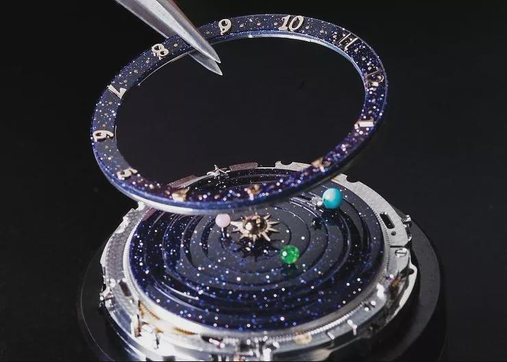 梵克雅宝还将视野放入宇宙和星球,在时间和空间的思索中,让作品具备穿越时空的力量。2014年发布的六颗行星围绕太阳的运行表,开发的机芯模件极致复杂。其在自动上链机械机芯的驱动下,每一个行星按照真实的椭圆轨迹移动。土星环绕表盘一周需时逾29年,木星需时12年,火星为687天,地球为365天,金星及水星分别为224及88天。