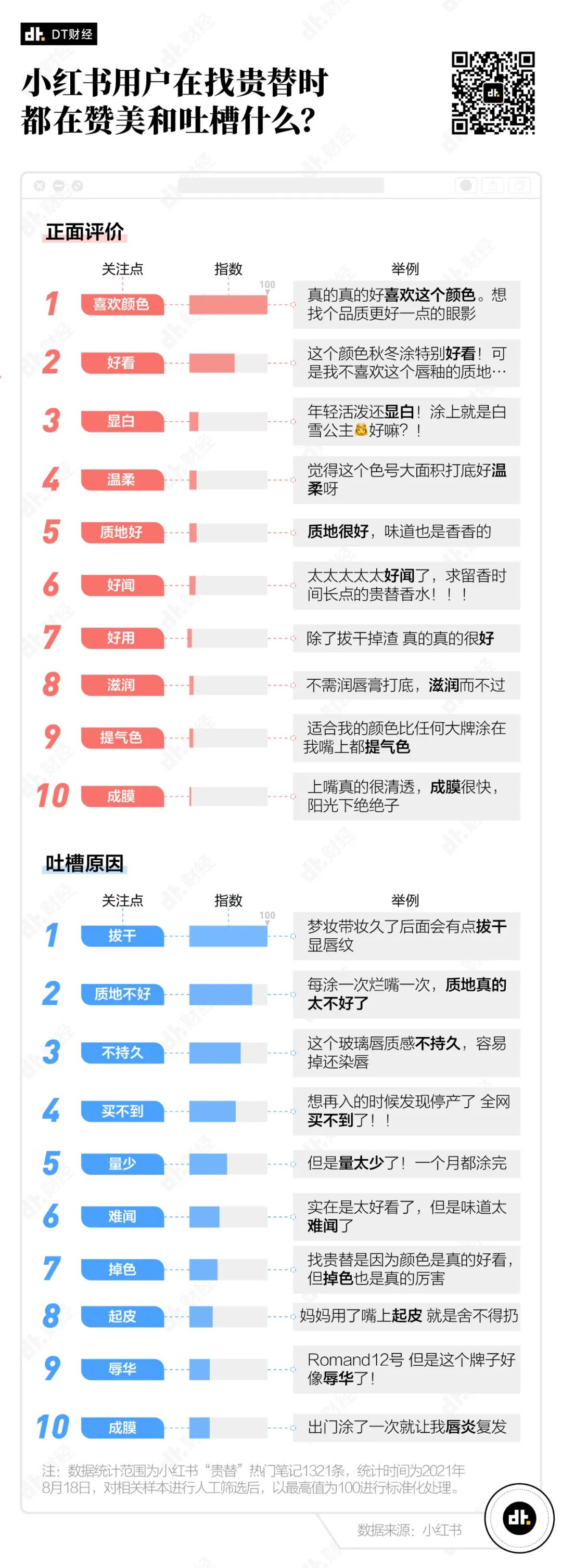 口红是出现次数最多的产品,连同唇釉、唇泥、唇膏等唇部化妆品一起占据了热门贵替榜TOP 10中的4席。口红作为不少女生的第一件化妆品,一直以来都是爱美人士的心头好。有人曾统计过,我国互联网用户在社交平台上对口红话题的讨论,占到了彩妆讨论的三分之一。