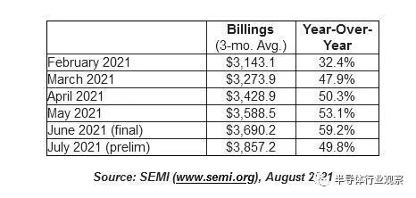 据SEMI统计,今年7月,北美半导体设备制造商出货金额为38.6亿美元,环比6月的36.9亿美元提升4.5%,相较于2020年同期的25.7亿美元,上升了49.8%,已是连续7个月创新高。
